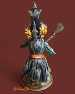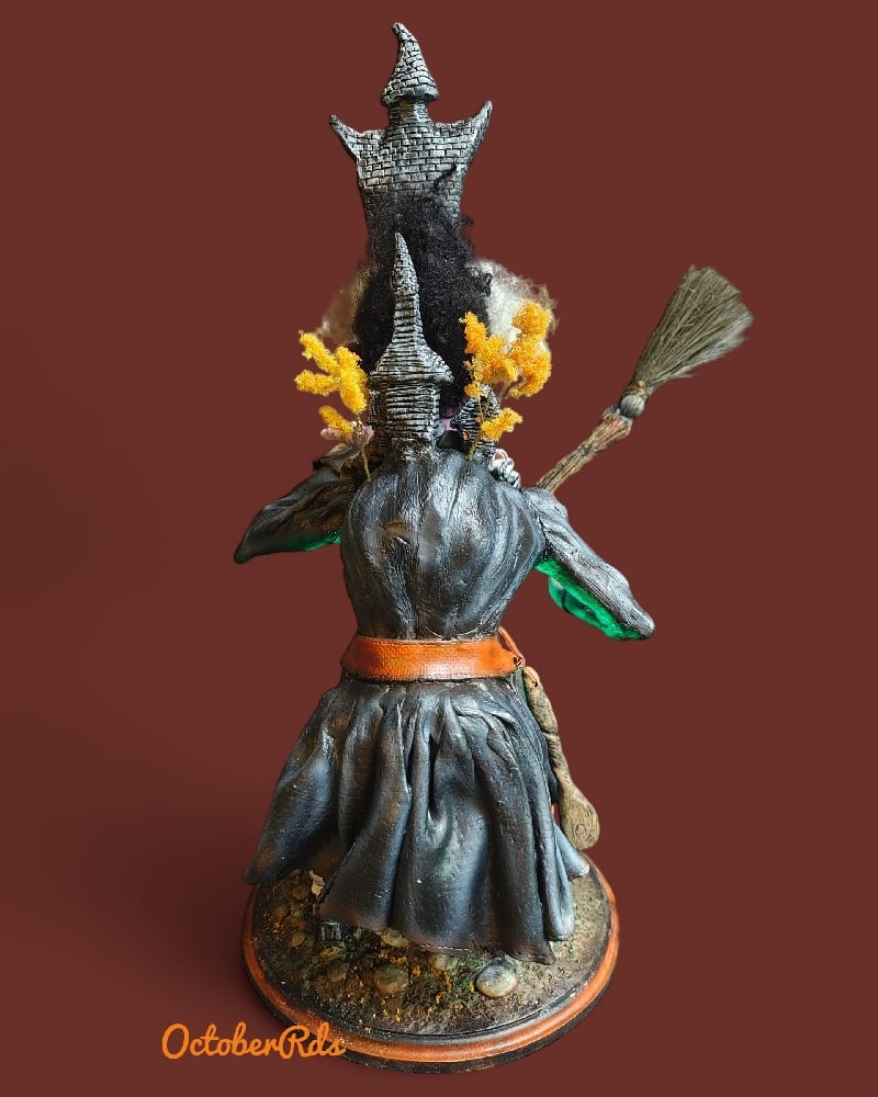 She is a one of a kind, fully hand sculpted creation. Fully sculpted from multiple types of polymer clay. She is meticulously hand painted and haired. I spared no detail with this one. She wears her mansion home hat. And has a small village on her hump. She has a spoon on one side of her belt and her boline on the other side. She stirs her light up pumpkin cauldron with her hand sculpted broom brewing up a potion while taking in the magic of the evening. She stands on a wood base with fully sculpted cobblestone street flooring. I can hear her cackle. I consider her to be my finest creation ever.