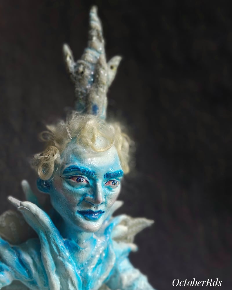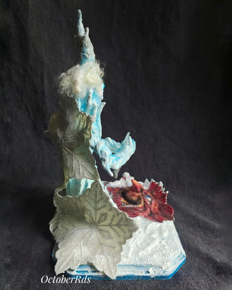 Here is the full reveal of my Jack Frost painting a leaf figure. He was inspired by my favorite ornament of all time (my favorite from childhood a 1987 Hallmark ornament). He is a one of a kind, hand sculpted creation. Sculpted from multiple types of polymer clay. The leaf as well. They are hand painted with acrylic paints and sealed. He has an attached fabric snowflake cape. And his hair is hand applied mohair. The ground is sculpted, painted and then covered with snow medium. His brush is an icicle with a paint brush on the end. His and the leaf's eyes, mouth, icicle, brush and castle are coated in clear resin for an ice look. He is finished with clear glitter for that frosted look.