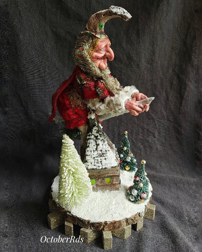 Befana, the snow cover and the house are hand sculpted from multiple types of polymer clay on a wire skeleton. Attached to a wood slice and glittered snowflake wood base.