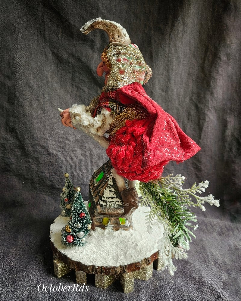 Befana wears a hand sculpted home hat. She rides a hand sculpted snow and ice broom with attached pine branches. Her shirt is faux fur, skirt is knitted fabric, wrap is plaid fabric and her cape is hand sewn fabric with a wire insert.
