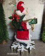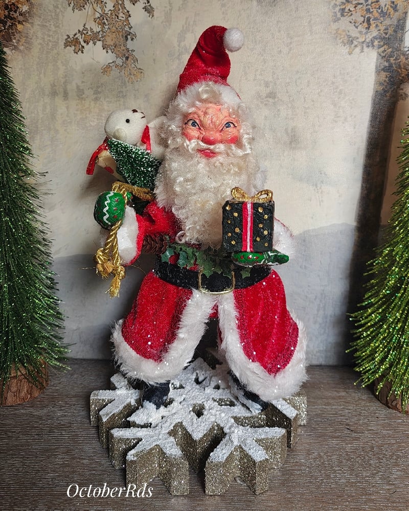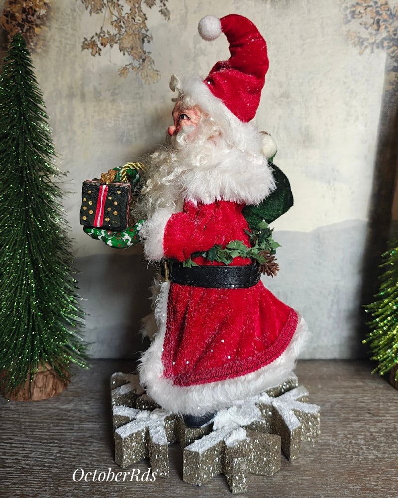 His head, hands and feet are hand sculpted from Cosclay over a wire skeleton. He is giving a gift in one hand, and holding his bag of toys in the other. He wears a fabric outfit that has been sealed and dusted with glitter.