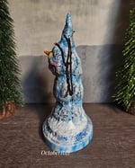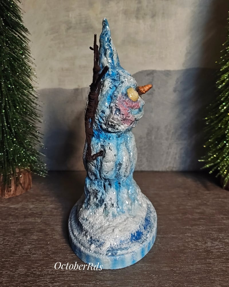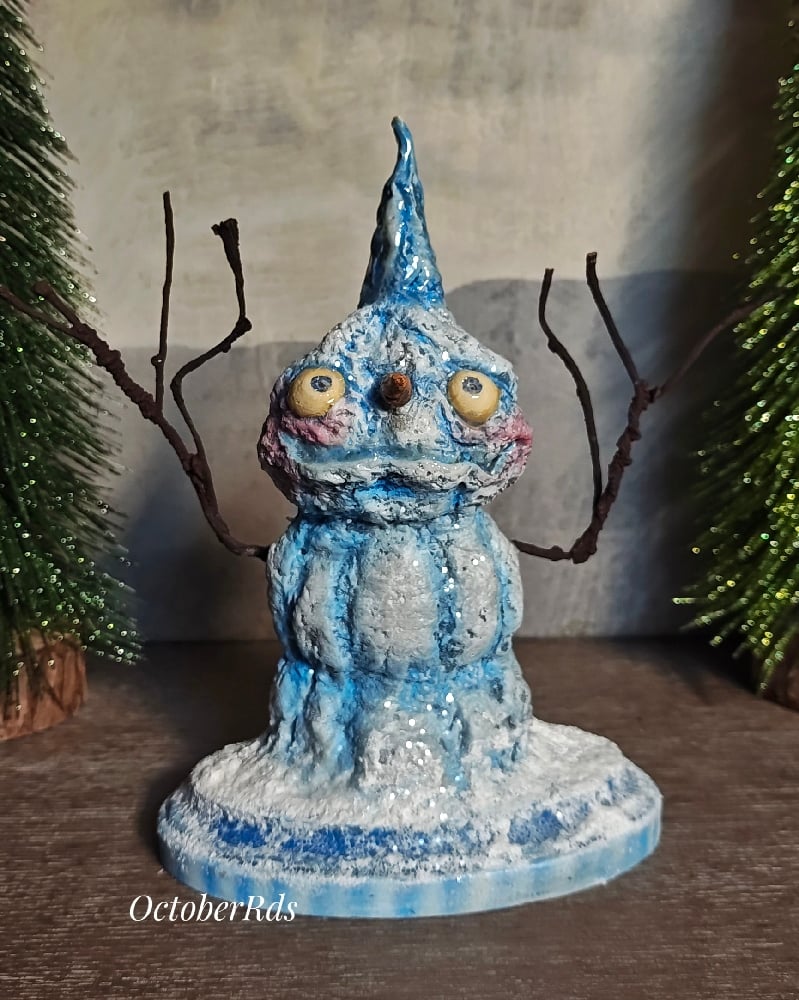 The Snowman Pumpkin Witch is sculpted from Cosclay. She is painted with acrylic paints and sealed. The branch arms are posable. Her eyes, mouth and hat are finished with resin. And she is finished with glitter. She measures about 7.25 inches tall.